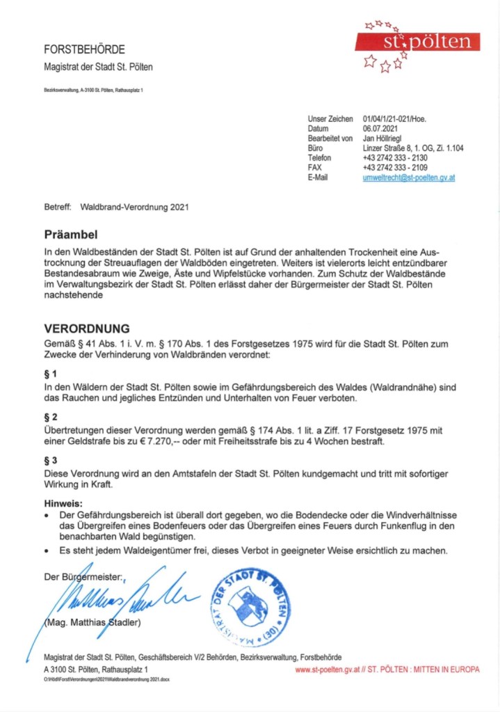 Die Waldbrandverordnung für den Bezirk St. Pölten tritt per sofort in Kraft!