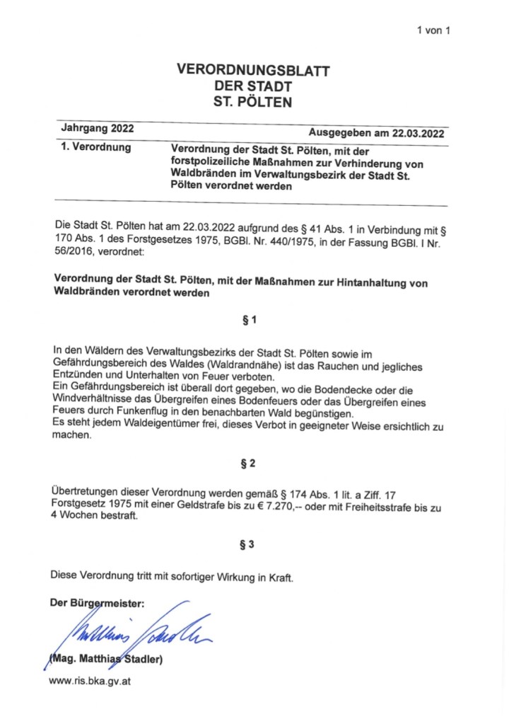 Die Waldbrandverordnung für den Bezirk St. Pölten tritt per sofort in Kraft!