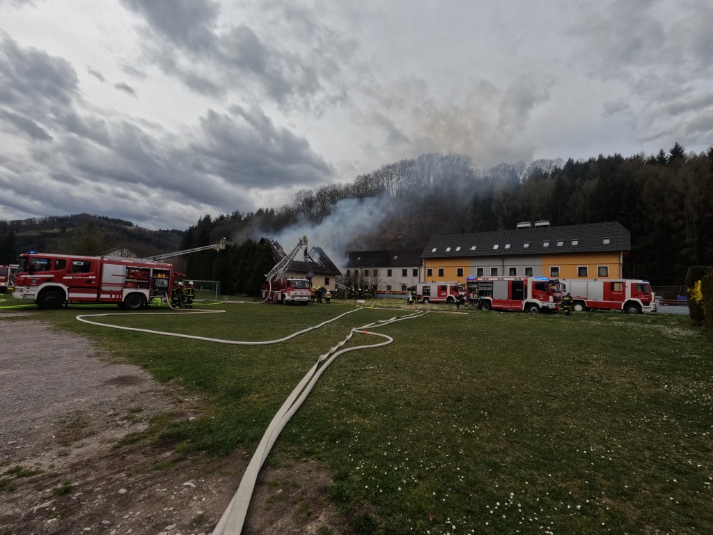 Unsere Aufgabe war es das Nebengebäude zu schützen und eine Zubringleitung aufzubauen. Zeitgleich meldete sich 1 Atemschutztrupp am Sammelplatz, falls dieser benötigt wird. Da das Dachkonstrukt völlig ausgebrannt ist, wurde hauptsächlich von außen mittels Drehleitern und C-Strahlrohren gelöscht.