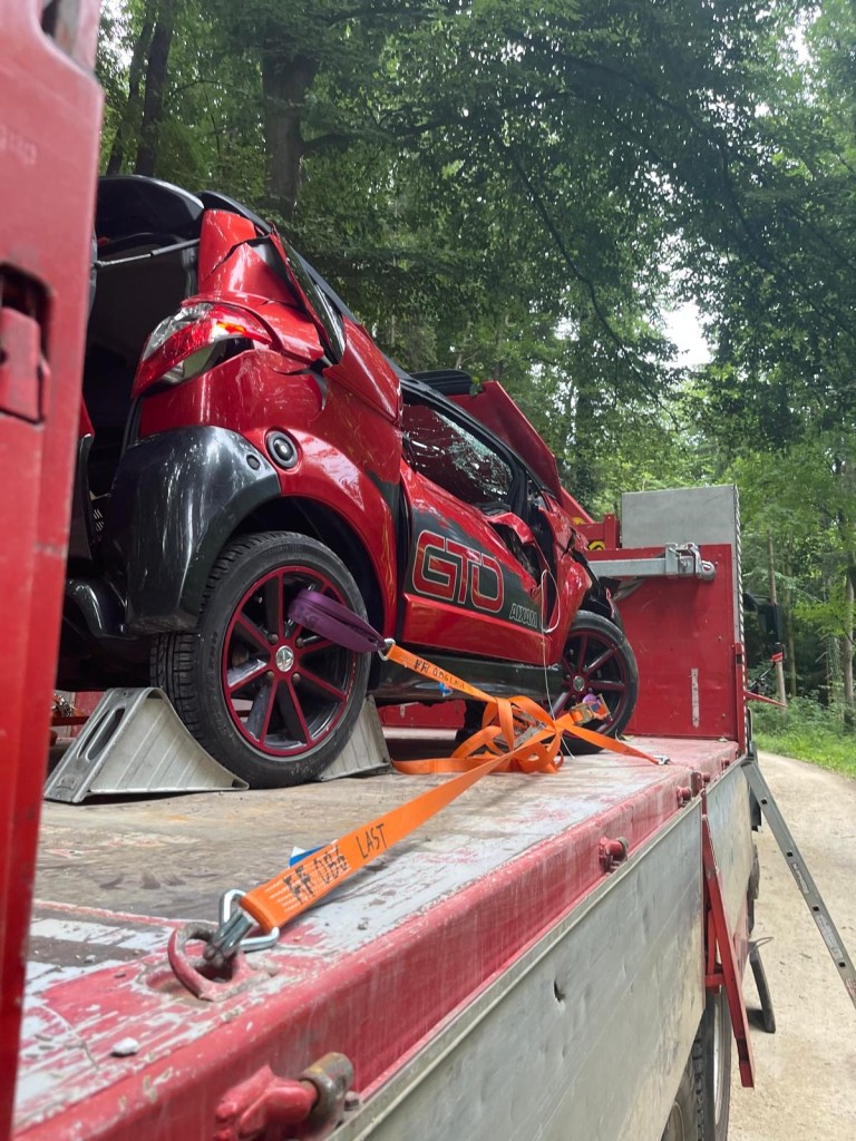 Die Fahrzeugbergung erfolgte mittels Kran unseres WLFA. Nach Sicherungsarbeiten und Aufbau des dreifachen Brandschutzes wurde das Unfallwrack aus dem Bach gehoben. Anschließend wurden Betriebsmittel gebunden und die Unfallstelle gesäubert.