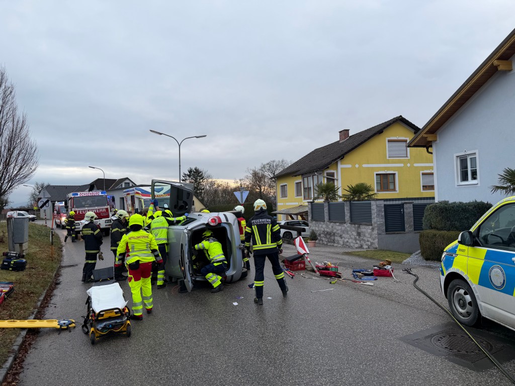 Der Lenker eines Fahrzeuges war in Altmannsdorf von der Fahrbahn abgekommen, wodurch das Fahrzeug zur Seite kippte und auf der Fahrerseite liegen blieb. Der Lenker wurde im Fahrzeug eingeschlossen und wurde über den Kofferraum aus dem Fahrzeug befreit.