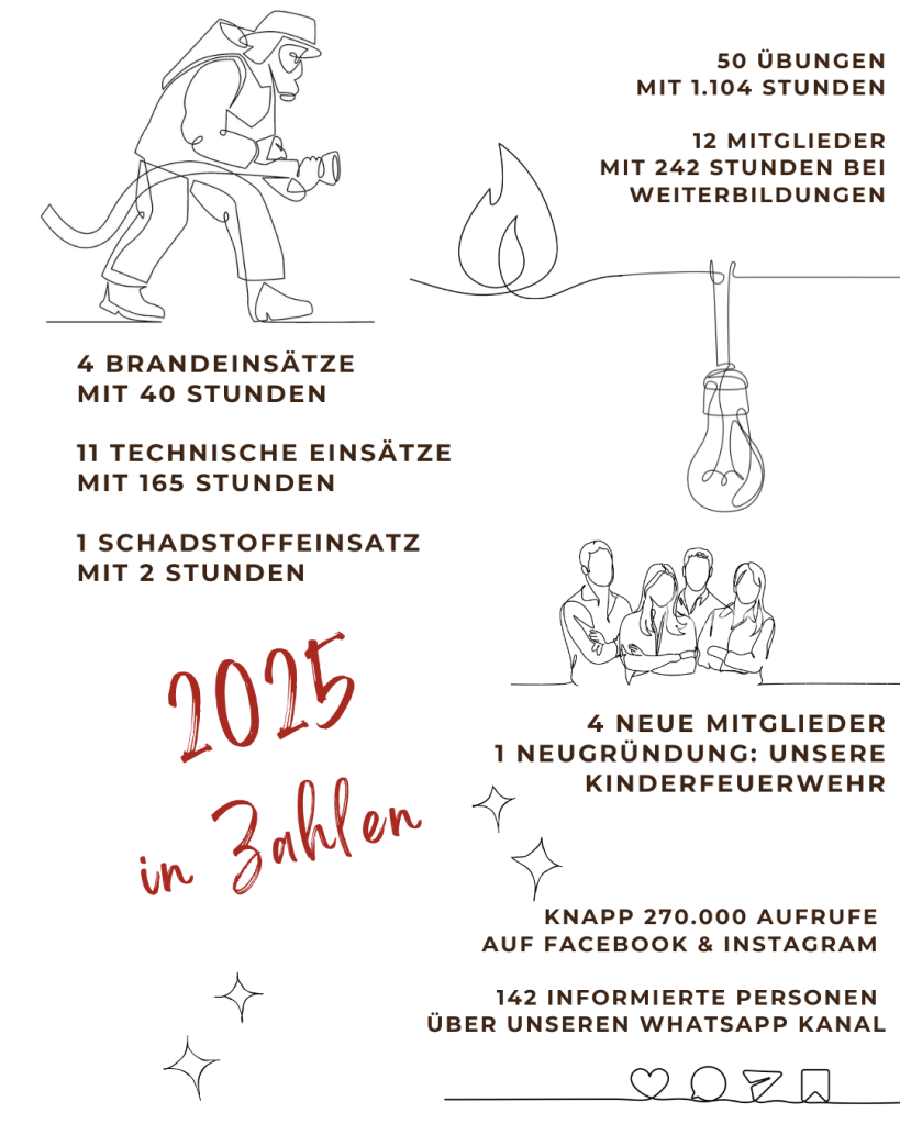 Die Berichte des Kommandos ließen das Jahr 2025 Revue passieren und zogen Bilanz: 527 Ereignisse mit 2.428 Mitglieder und 8.029 Stunden. Besonders groß war die Freude über vier Neuzugänge und die Gründung der Kinderfeuerwehr.