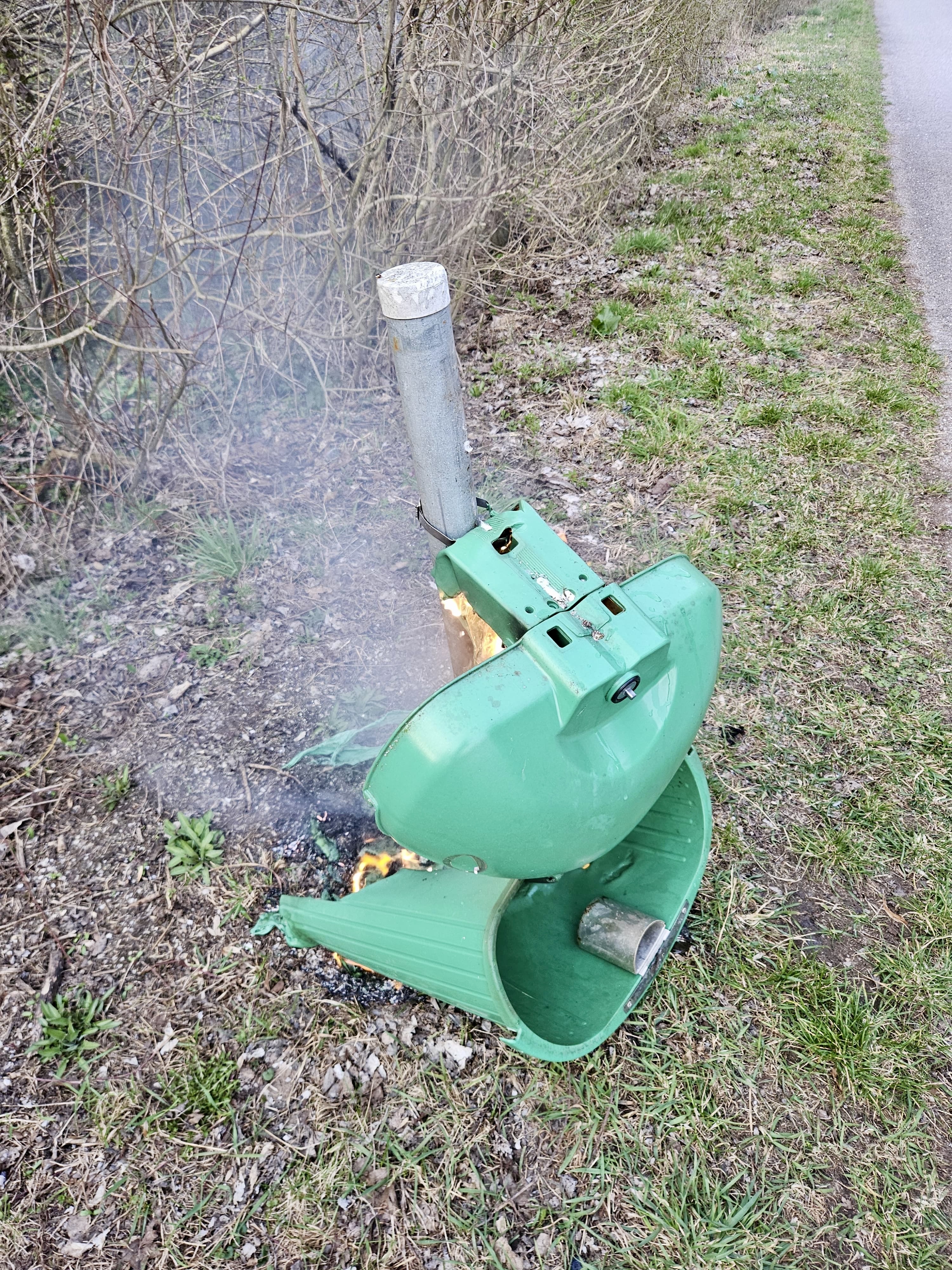 Ein brennender Müllbehälter neben einem Waldstück ist eine ernsthafte Gefahr, die bei Übergreifen zu einem Waldbrand führen kann. Durch die rasche Alarmierung eines/einer aufmerksamen Passanten/Passantin konnte heute Schlimmeres vermieden werden.